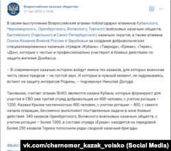 Отаман Всеросійського казачого товариства Микола Долуда називає кількість «добровольців» із Криму з-поміж козаків – «400 осіб, з урахуванням ротації – 800, від самого початку операції беззмінно виконують поставлені завдання в зоні бойових дій». Публікацію зроблено на сторінці казачого товариства в соцмережі «ВКонтакте».